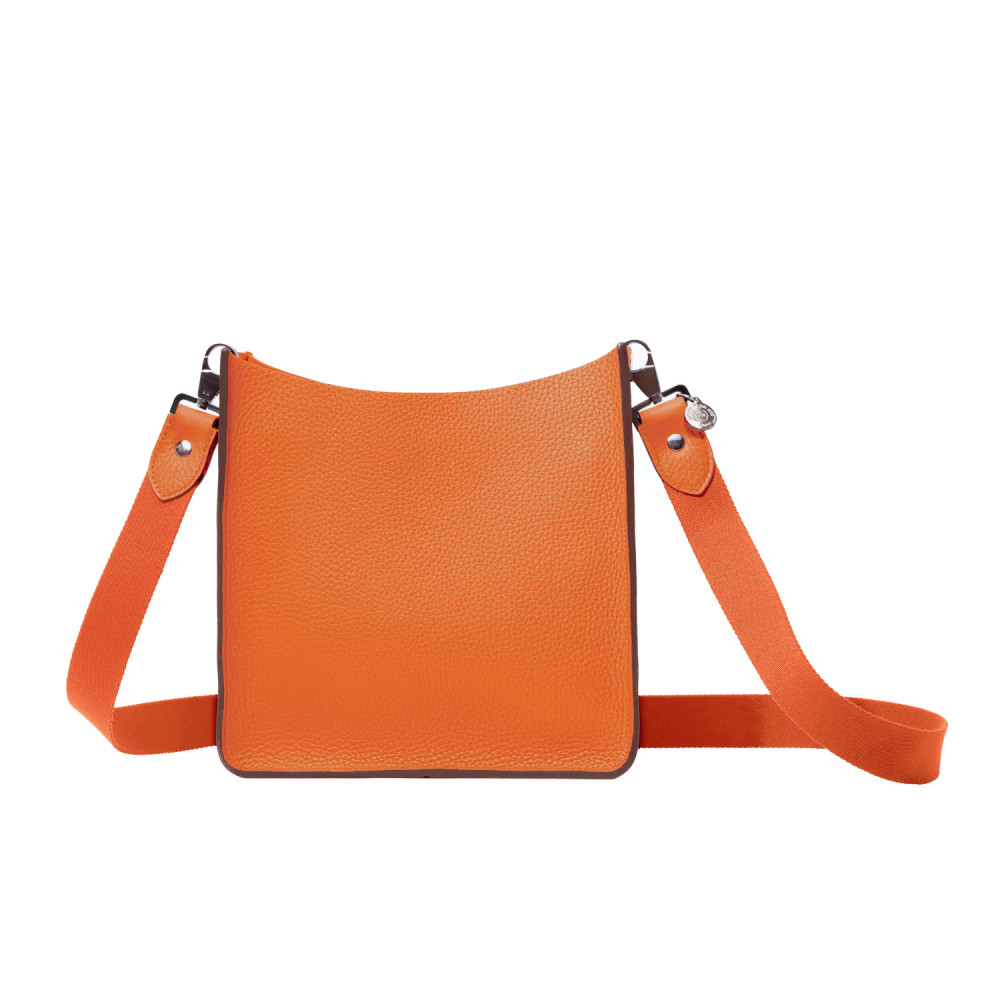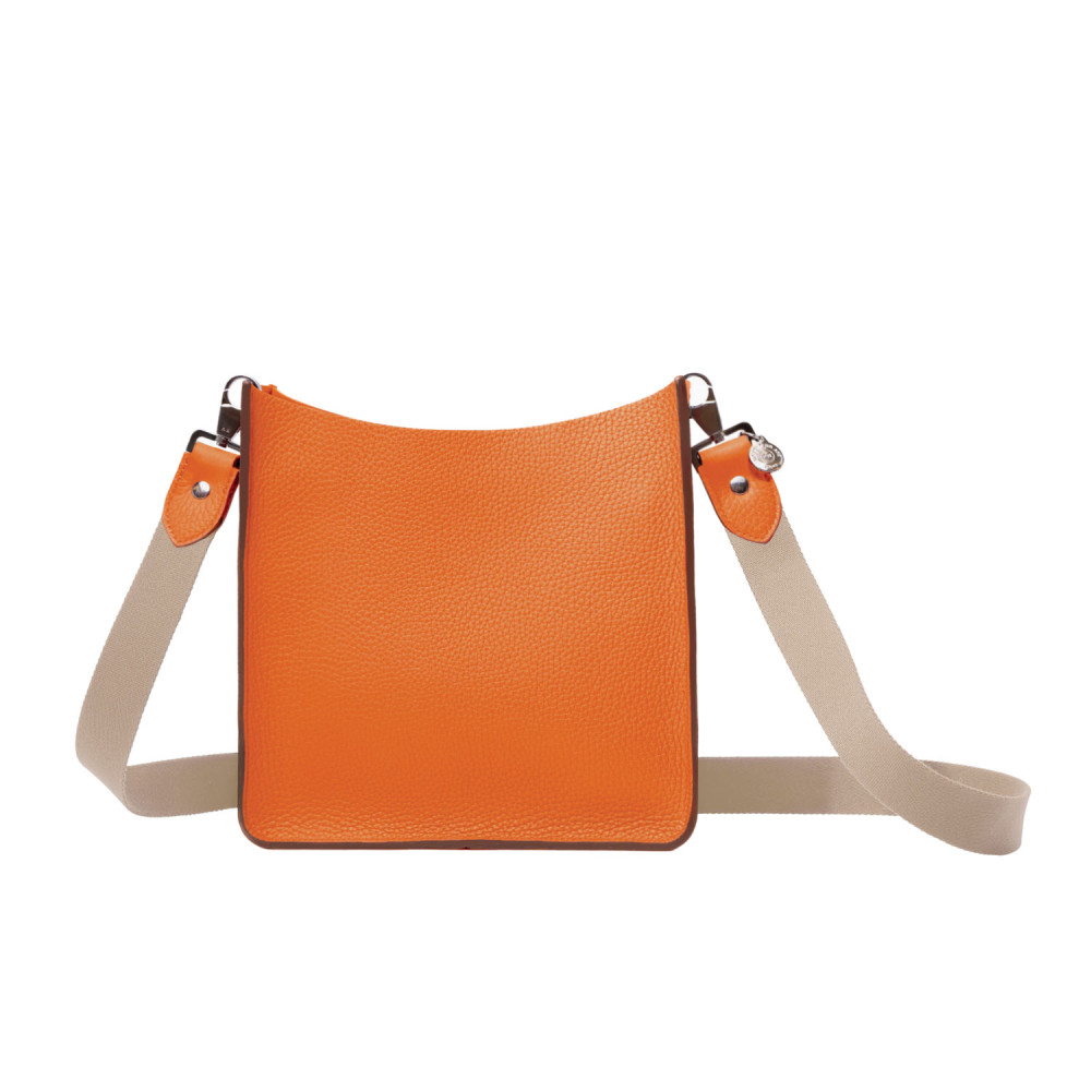 Sac en cuir grainé mat avec une bandoulière en tissu et une pochette intérieure en cuir lisse.