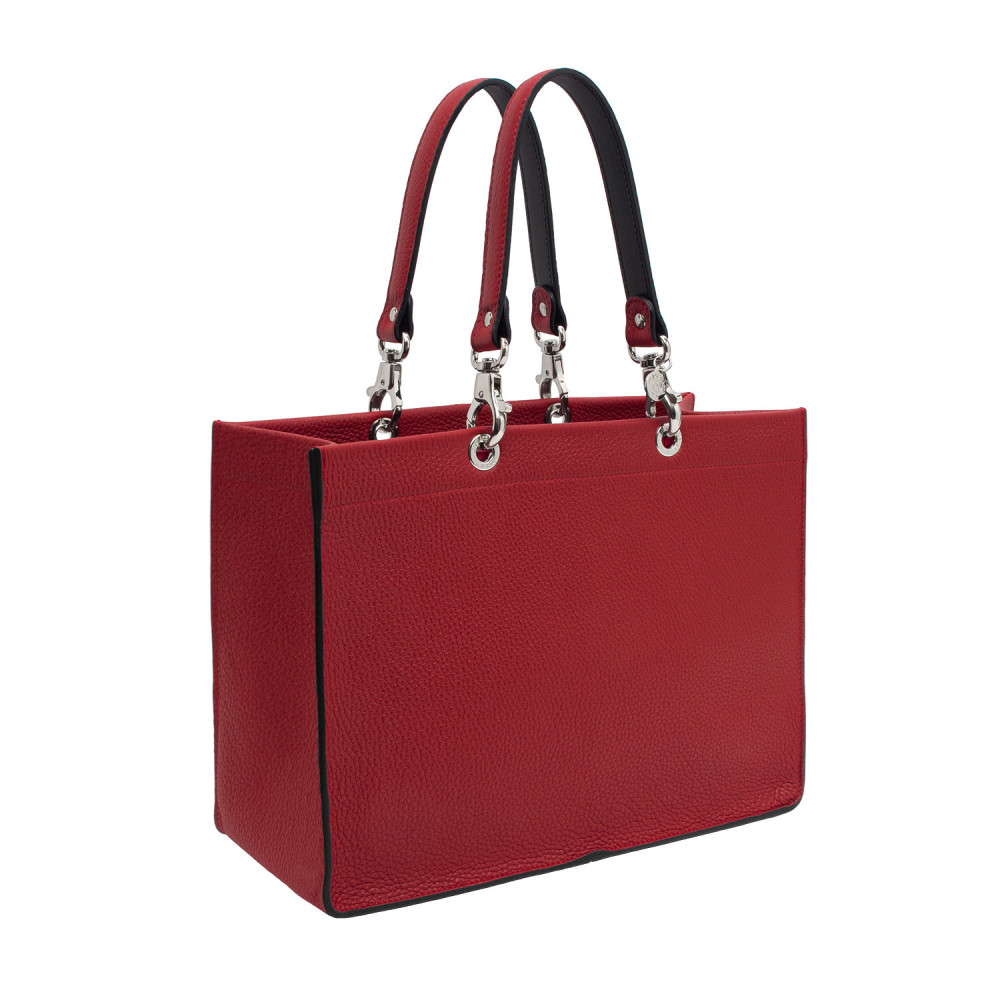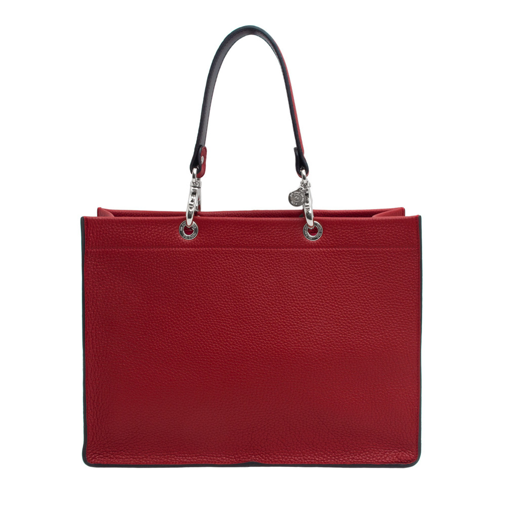 Cabas en cuir grainé mat, porté main. Il est proposé avec des poignées en cuir assorties et une pochette en tissu. Tous les éléments se détachent et sont interchangeables.