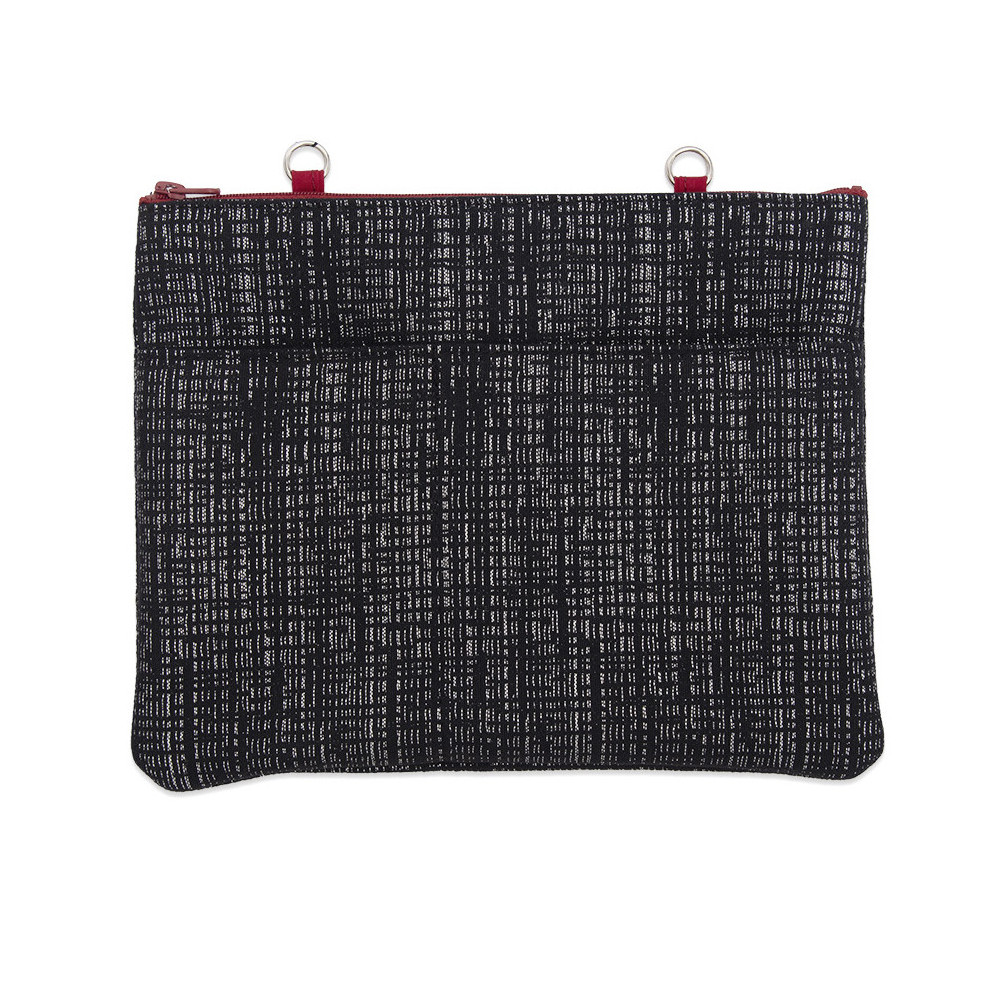 Pochette en textile avec fermeture éclair. Se fixe aux poignées à l’aide des deux anneaux. Avec 2 poches extérieures.Dimensions : L : 25cm x h : 20cm.
