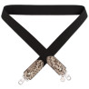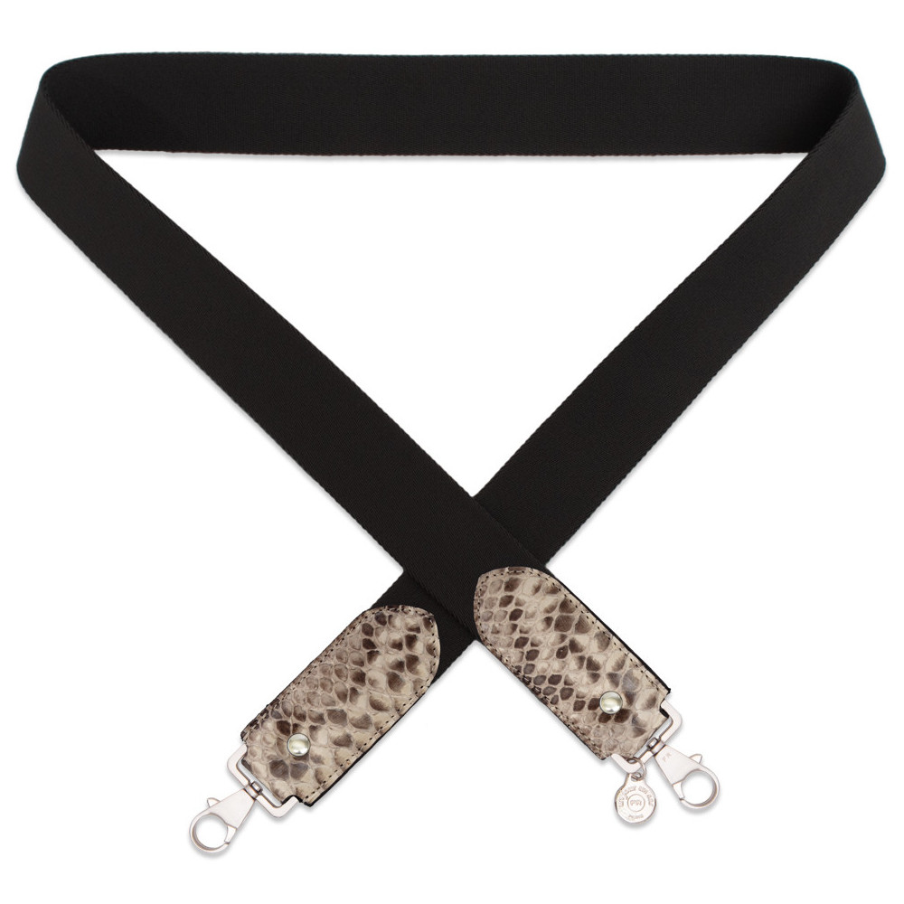 Bandoulière bi-matière en tissu et python. Mousquetons fin en métal argenté. Longueur : 115cm.