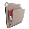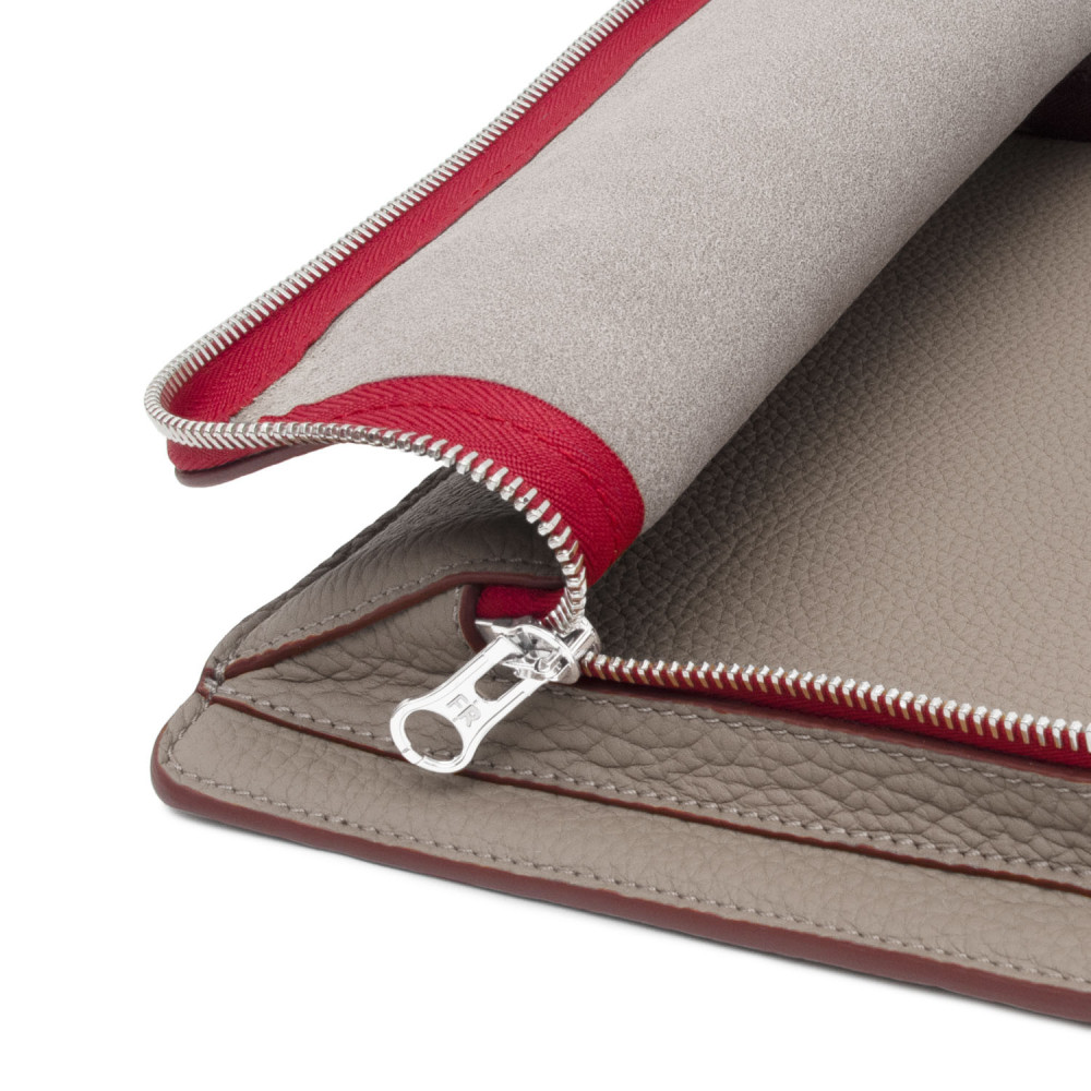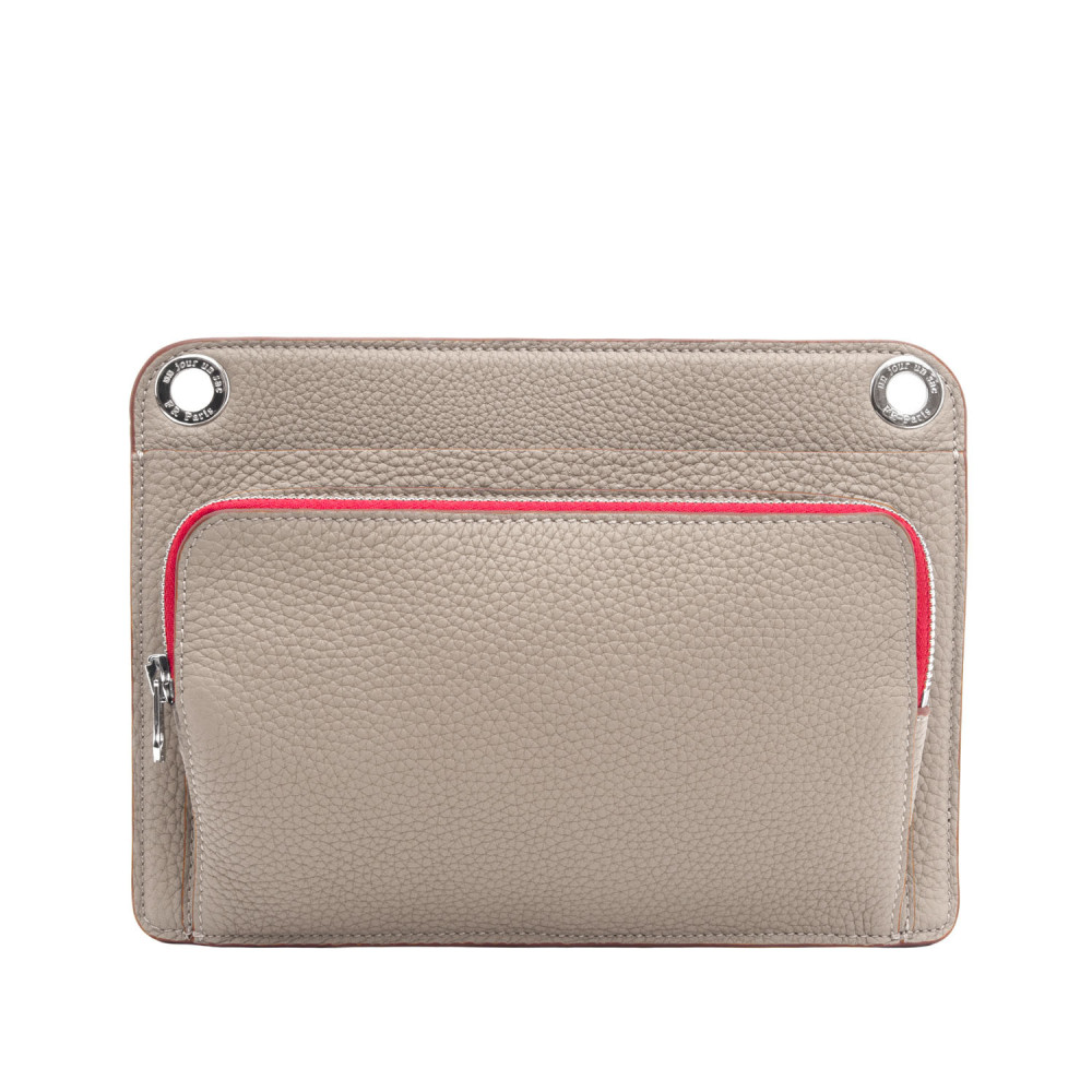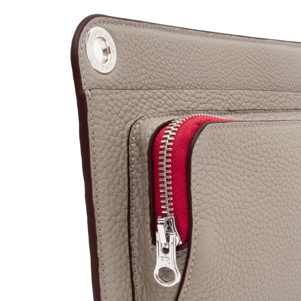 Sac en cuir avec bandoulière assortie en tissu et cuir, poche extérieure avec fermeture éclair.