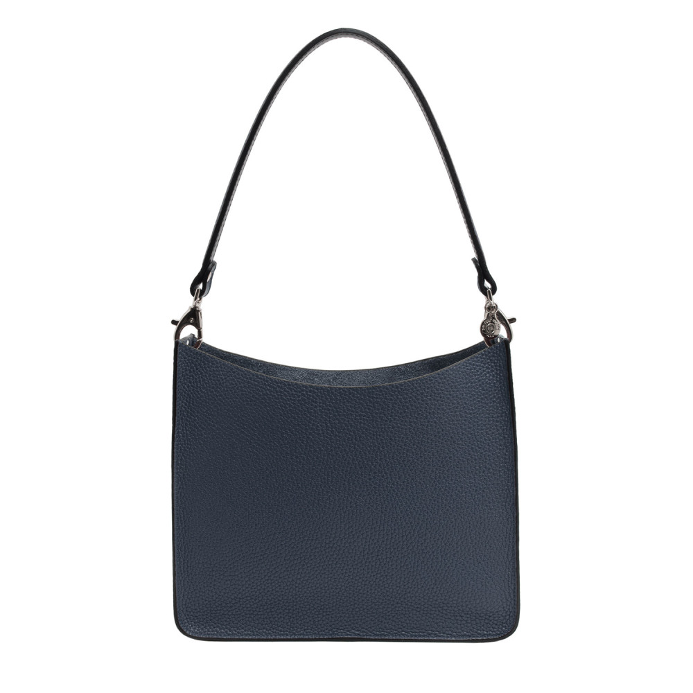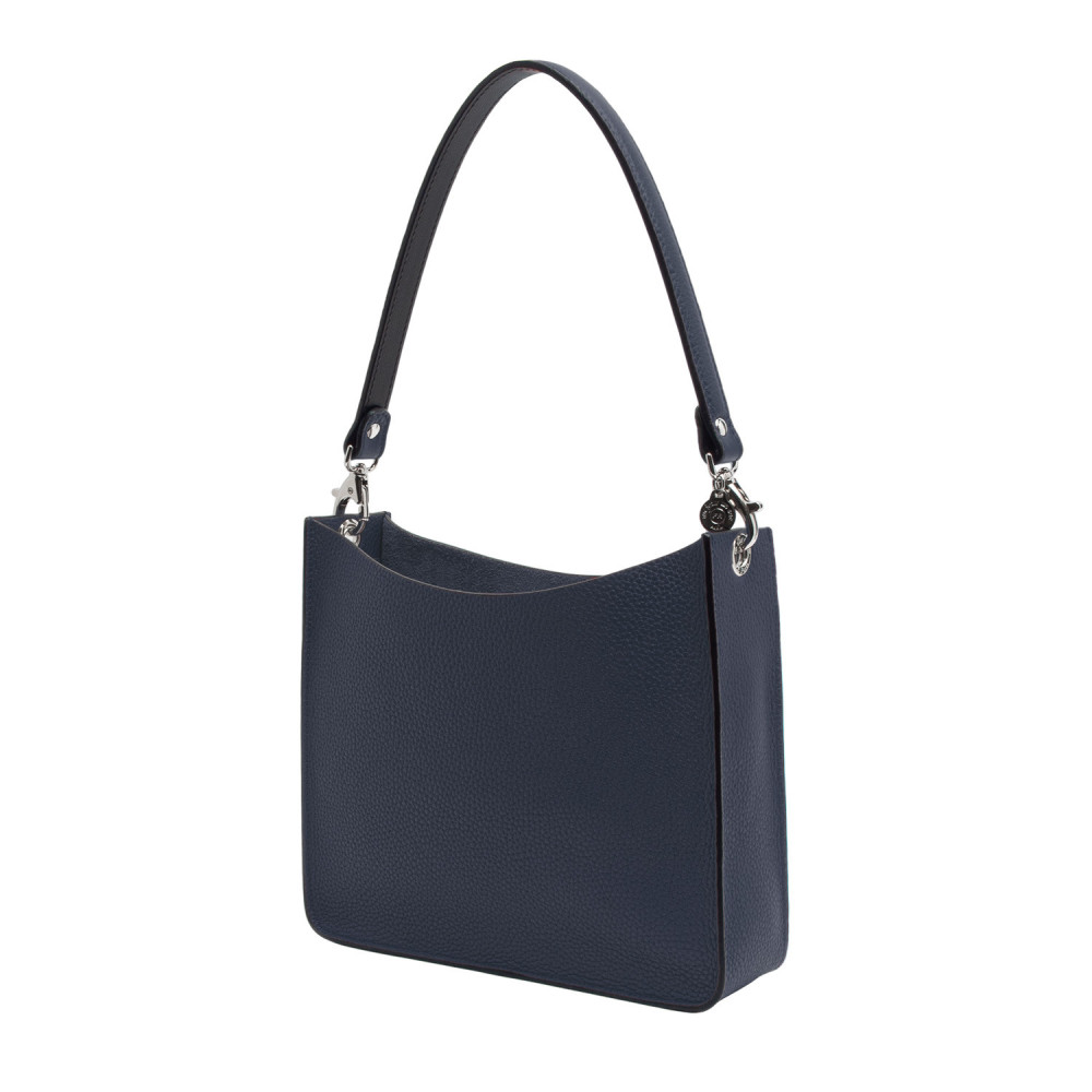 Shoulder bag in matt grained leather with matching handle. Inside the bag, the leather pouch closes with a zipper. The bag’s elements unhook. Change the handle with a shoulder strap of reference VBBULL100 to wear the bag cross-body.