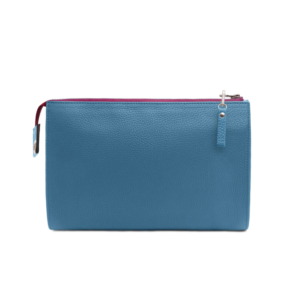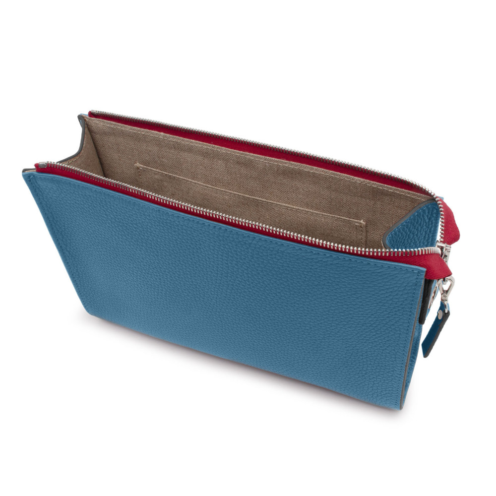 Hand-carried leather clutch with zipper. Fully lined in coated linen, with a pocket.