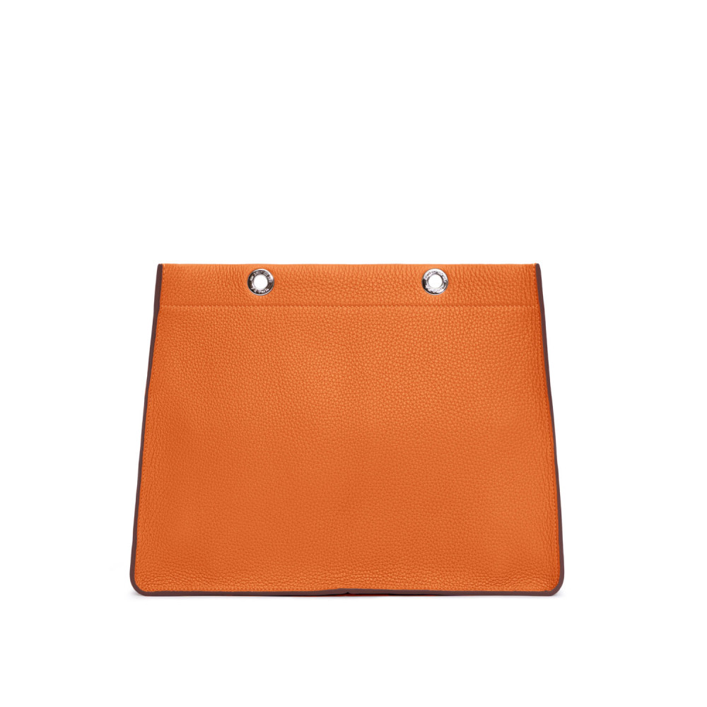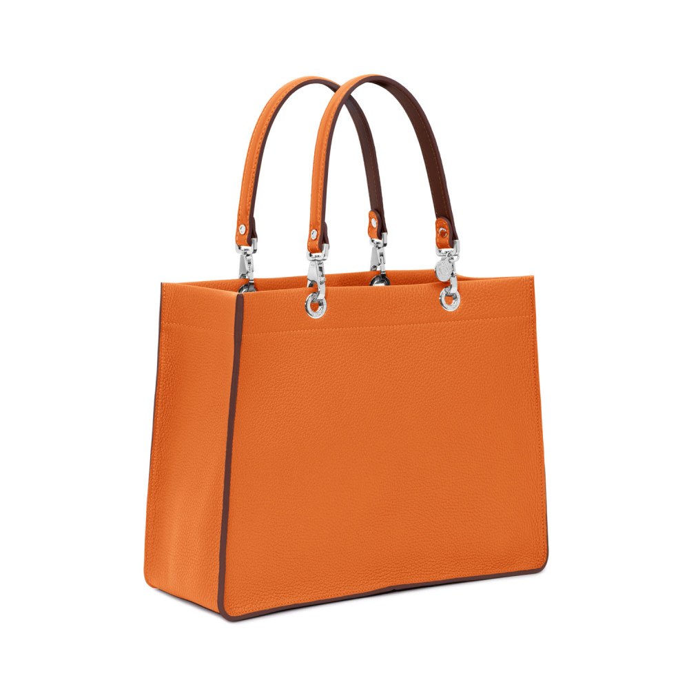 Leather handbag with short matching handles and a zipped fabric pouch. All of the elements unhook and are interchangeable.
