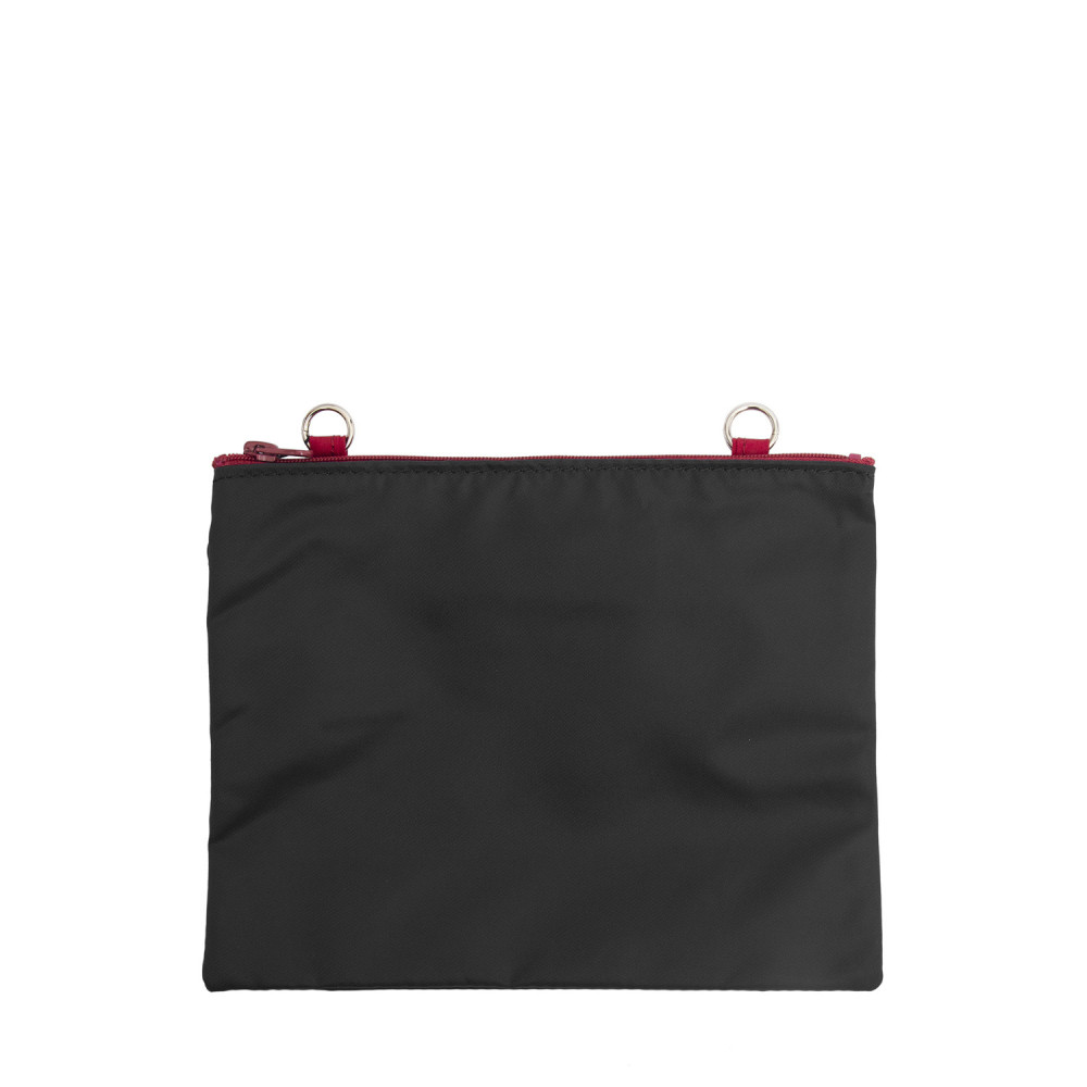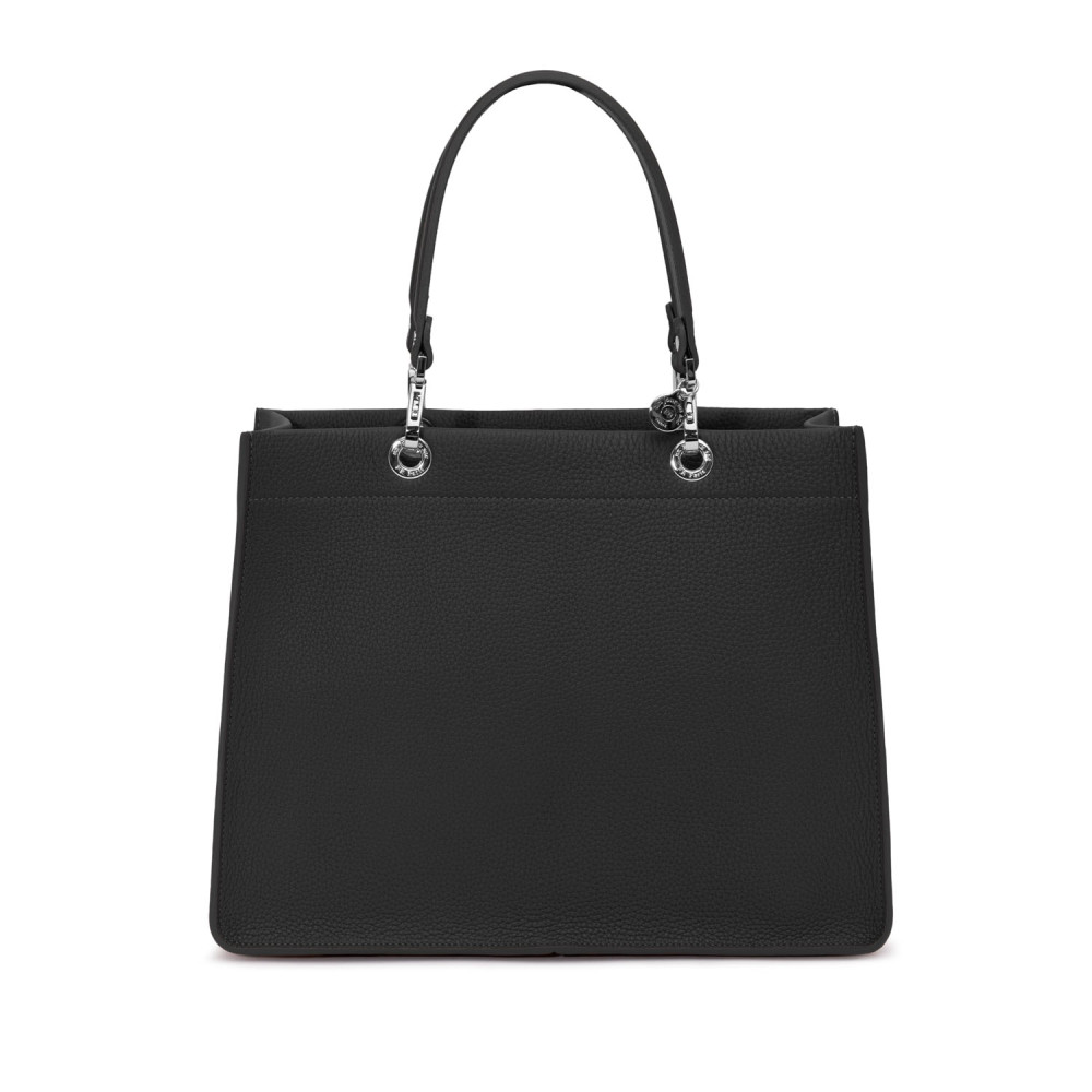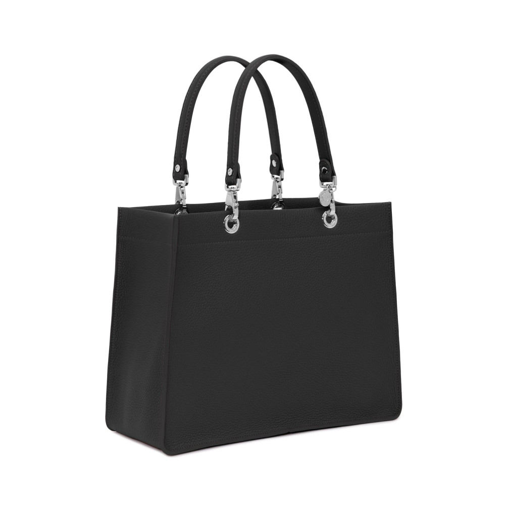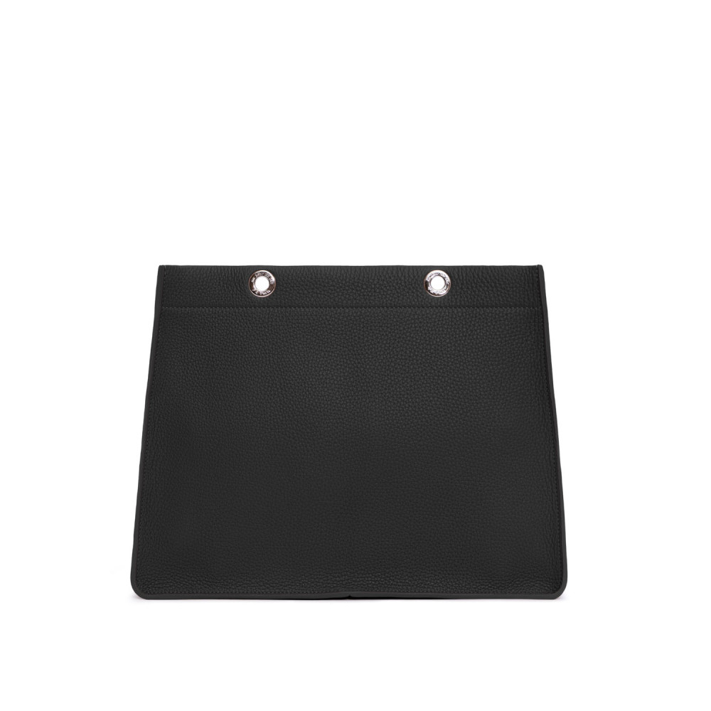 Leather handbag with short matching handles and a zipped fabric pouch. All of the elements unhook and are interchangeable.
