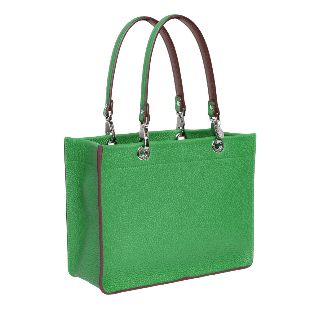 Leather handbag with short matching handles and a zipped fabric pouch. All of the elements unhook and are interchangeable.