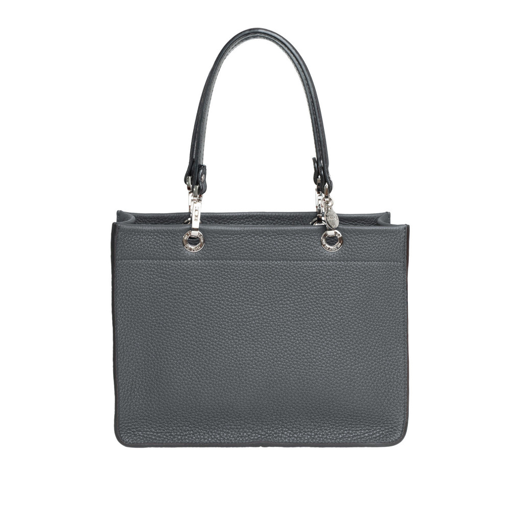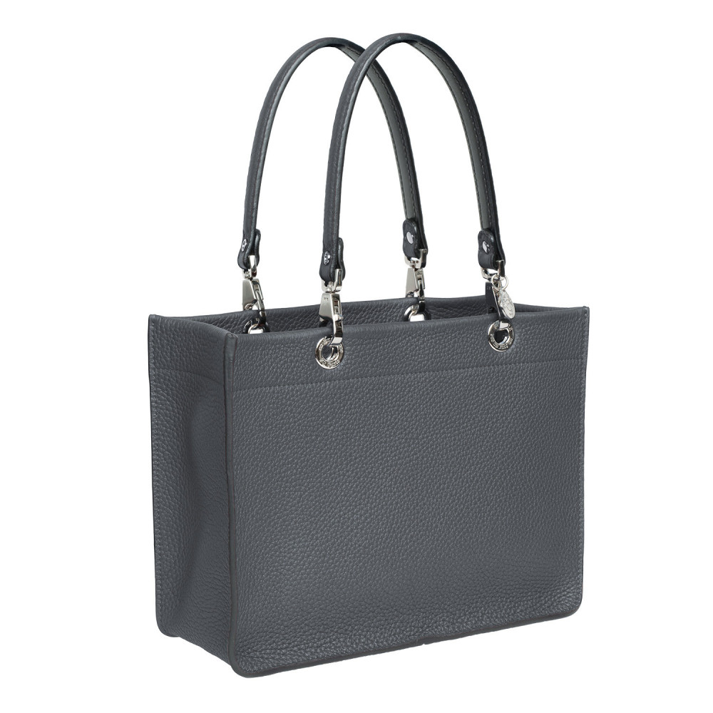 Leather handbag with short matching handles and a zipped fabric pouch. All of the elements unhook and are interchangeable.